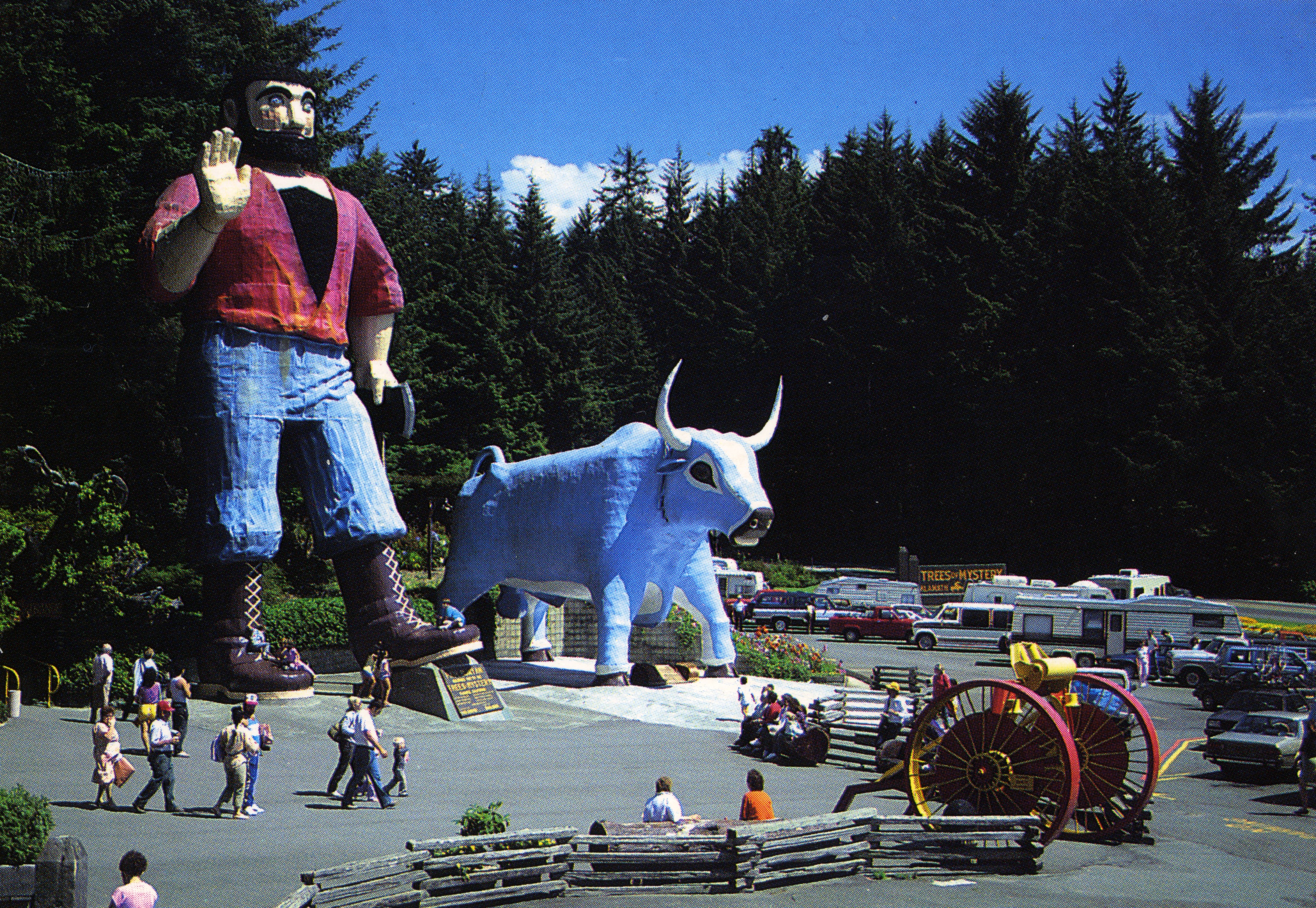 The Redwood sculpture, Paul Bunyan, (15 ton, 49 ft) nods, waves, and winks as he and Babe, the 34 ft, 17 1/2 ton Blue Ox, greet the many visitor to the Trees of Mystery.