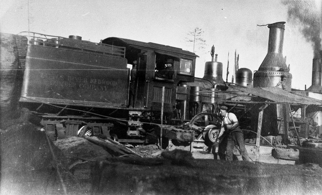 A spool donkey is shown next to a logging train in California, at Little River Redwood Company.