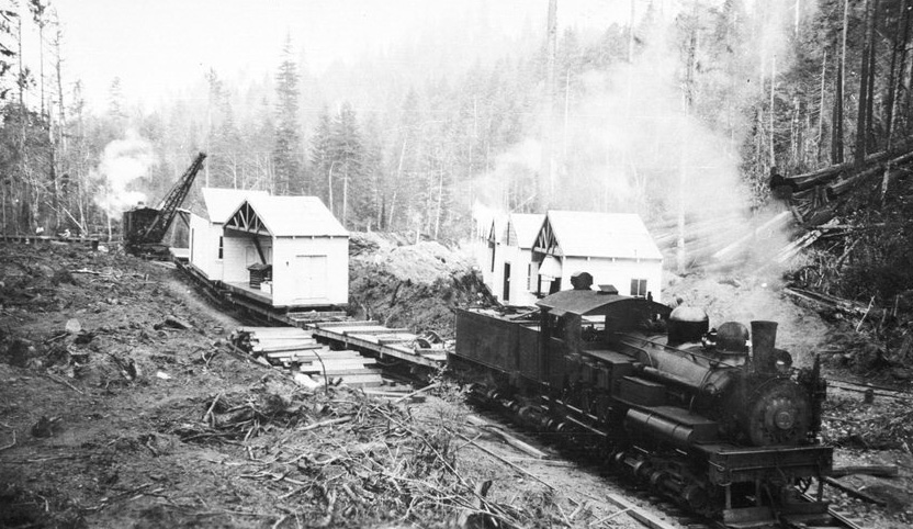 A steam shovel with a crane unloads house parts from flat cars behind locomotive No. 3 at a new logging camp for Hammond Lumber Company.