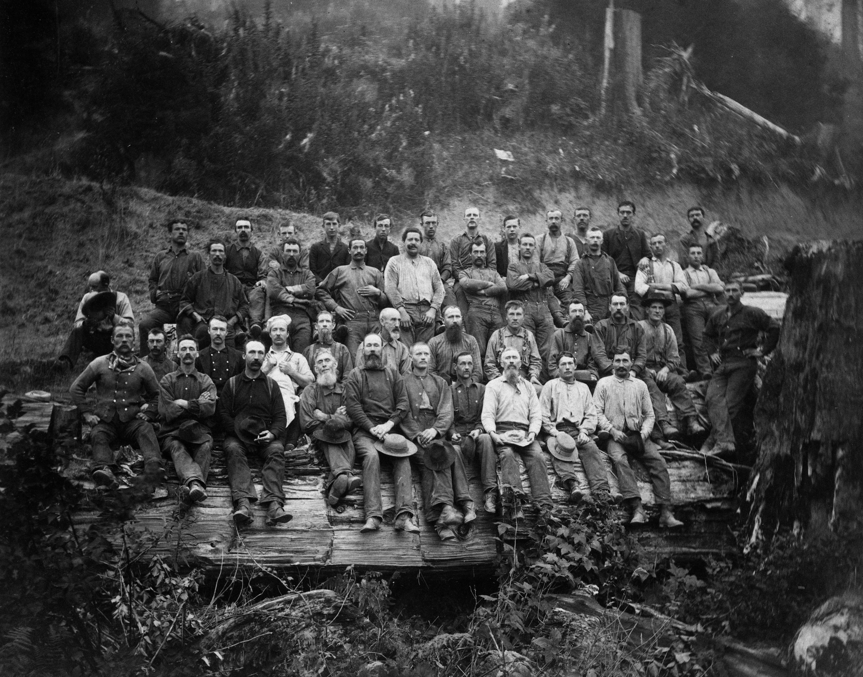 A portrait of a large group of workers in a logging camp.