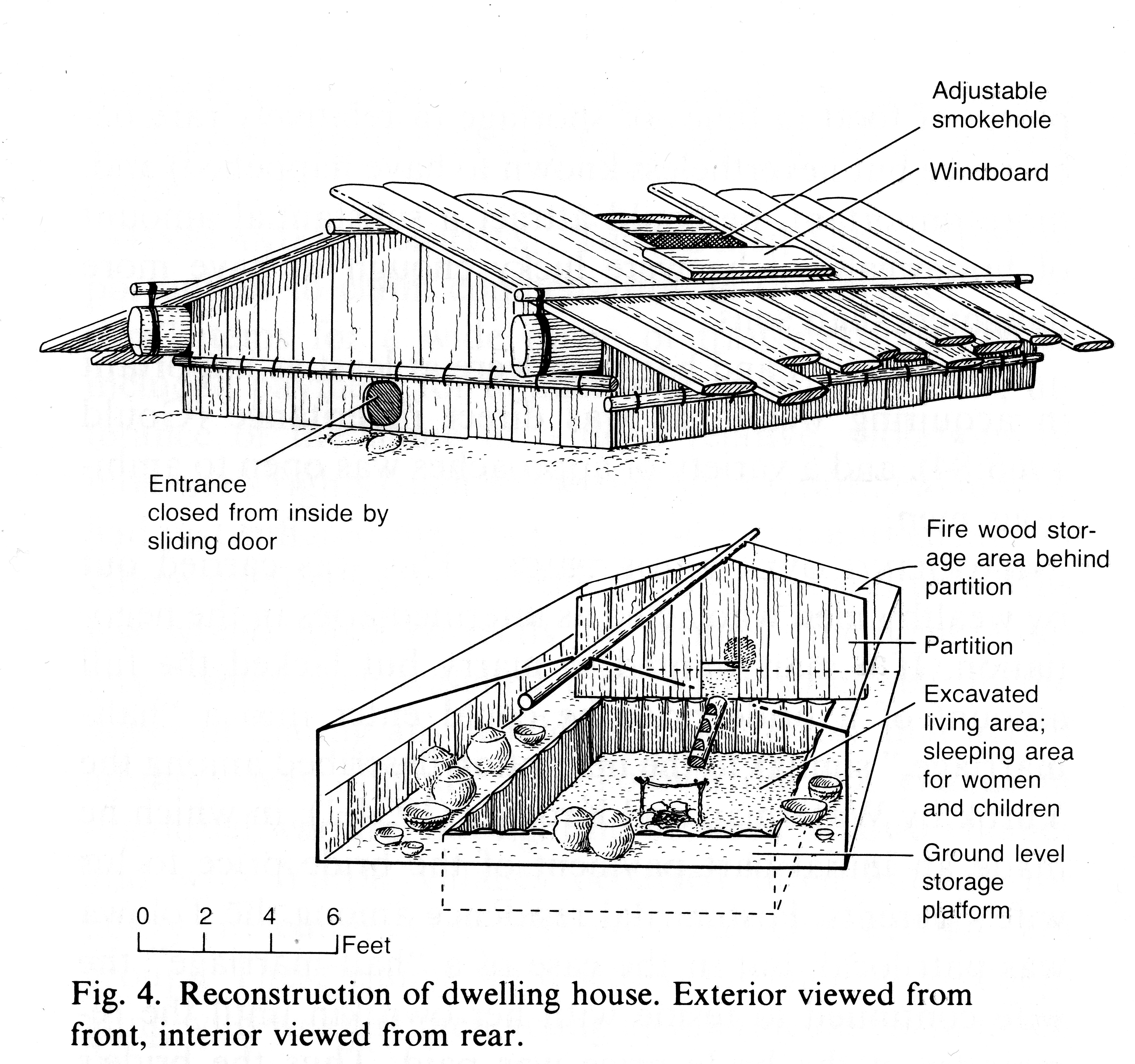 This is a schetch reconstruction of the exterior view from front; Interior view from back of Tolowa redwood plank-style house