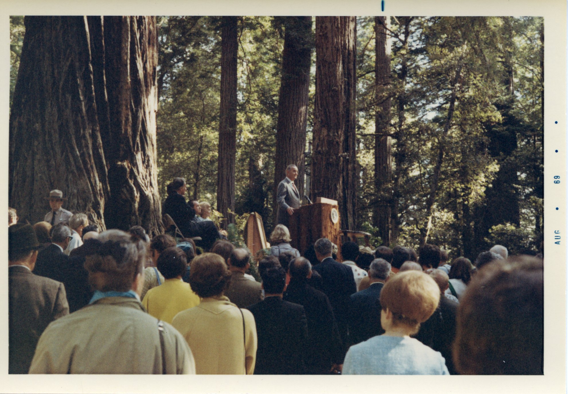 A color photograph of Lyndon B. Johnson addressing a crowd at the dedication of Lady Bird Johnson Grove.