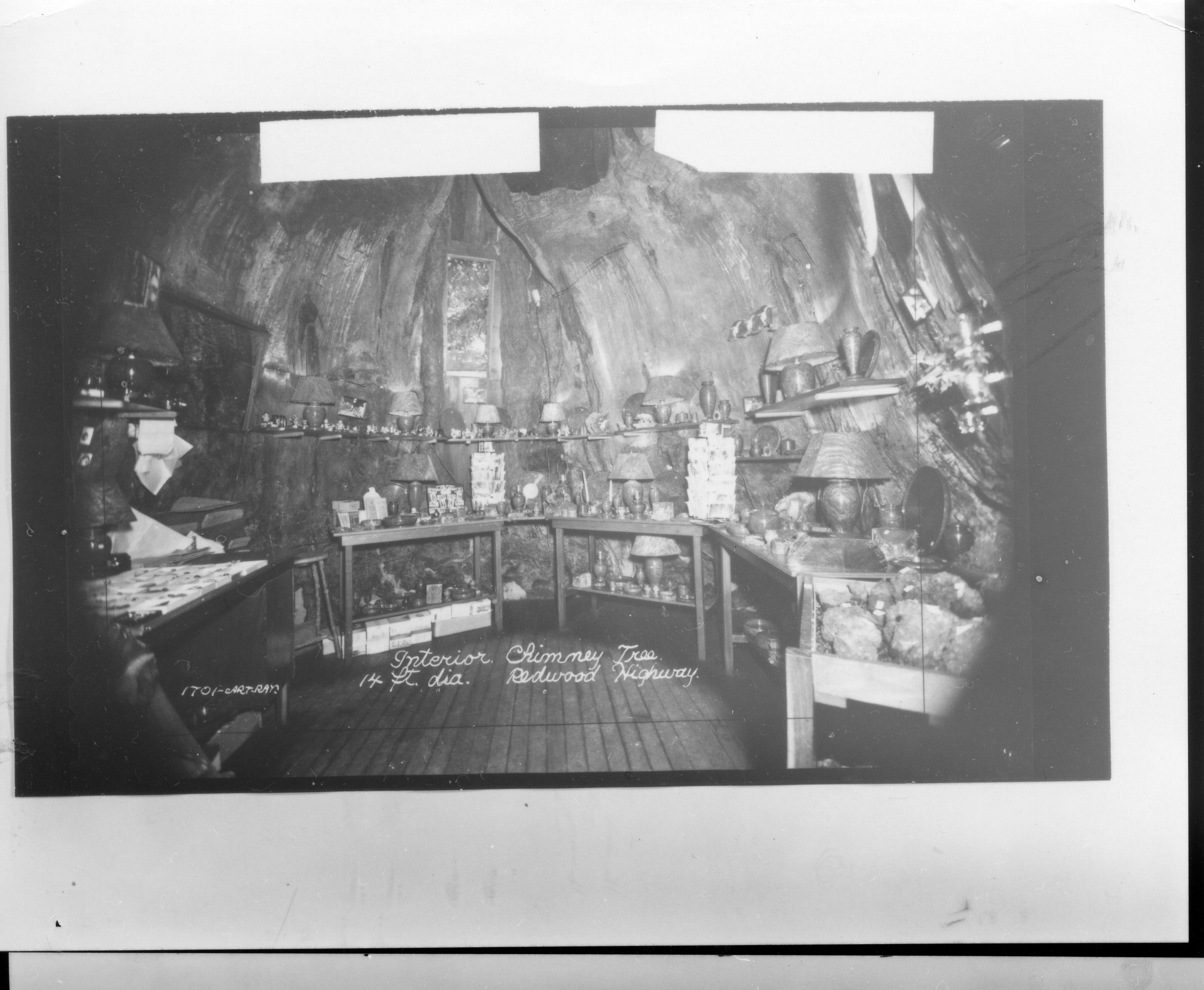 Interior view of the Chimney Tree, 14 ft. in diameter, located on Redwood Highway. Private collection of redwood article on display.