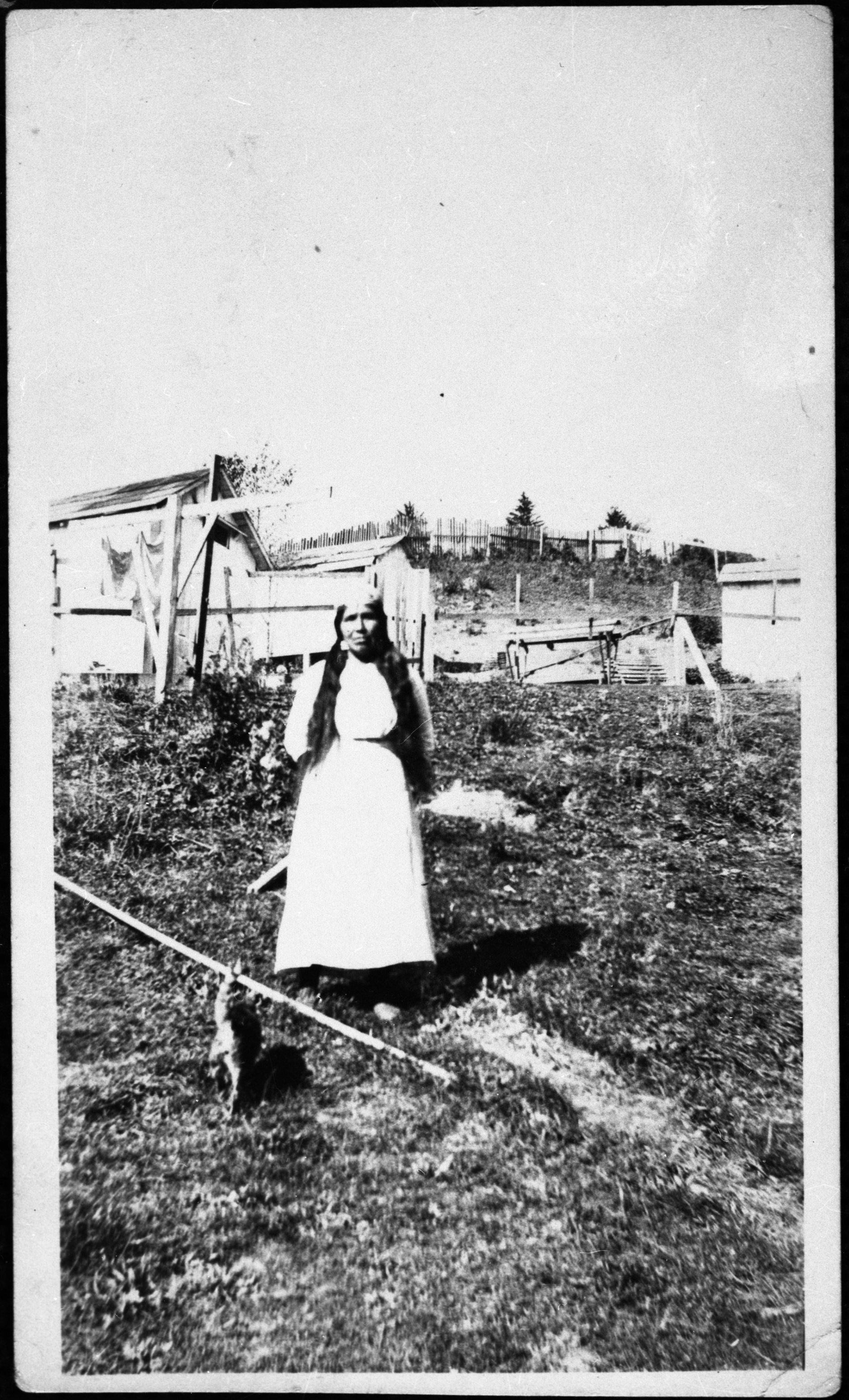 Yurok woman standing in front of traditional redwood plank-style houses.