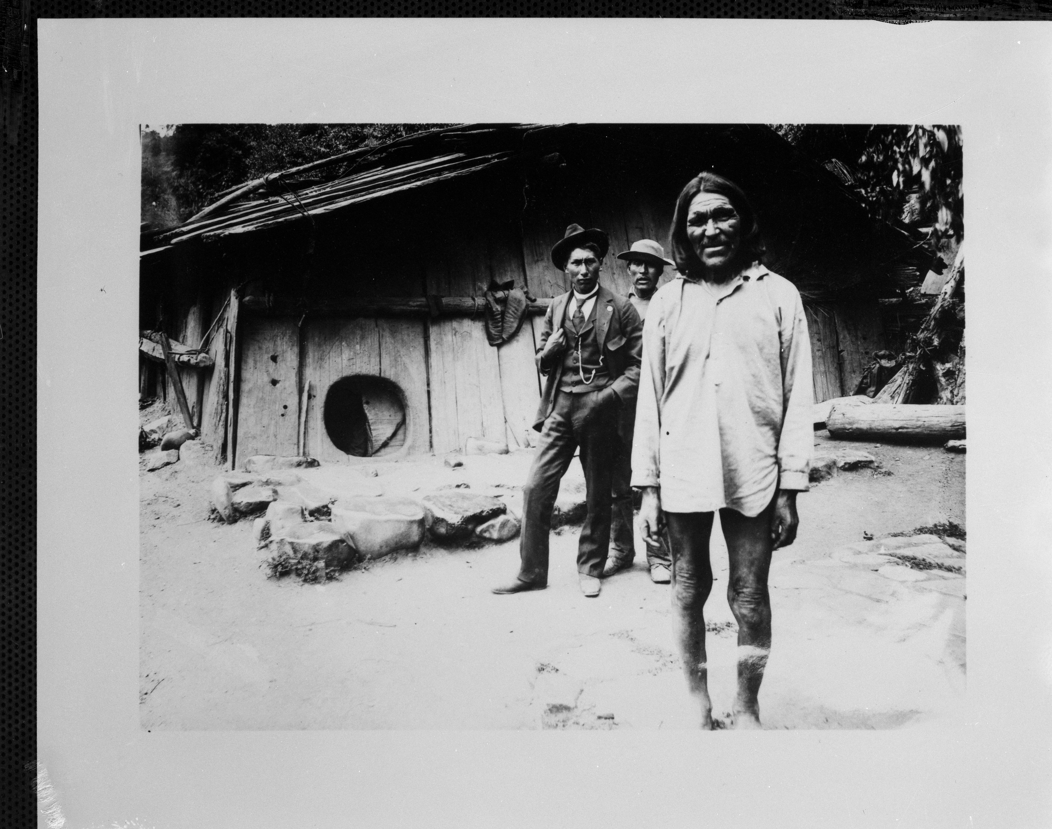 Portrait of three Indigenous men from the Yurok tribe standing in front of a traditional redwood house.