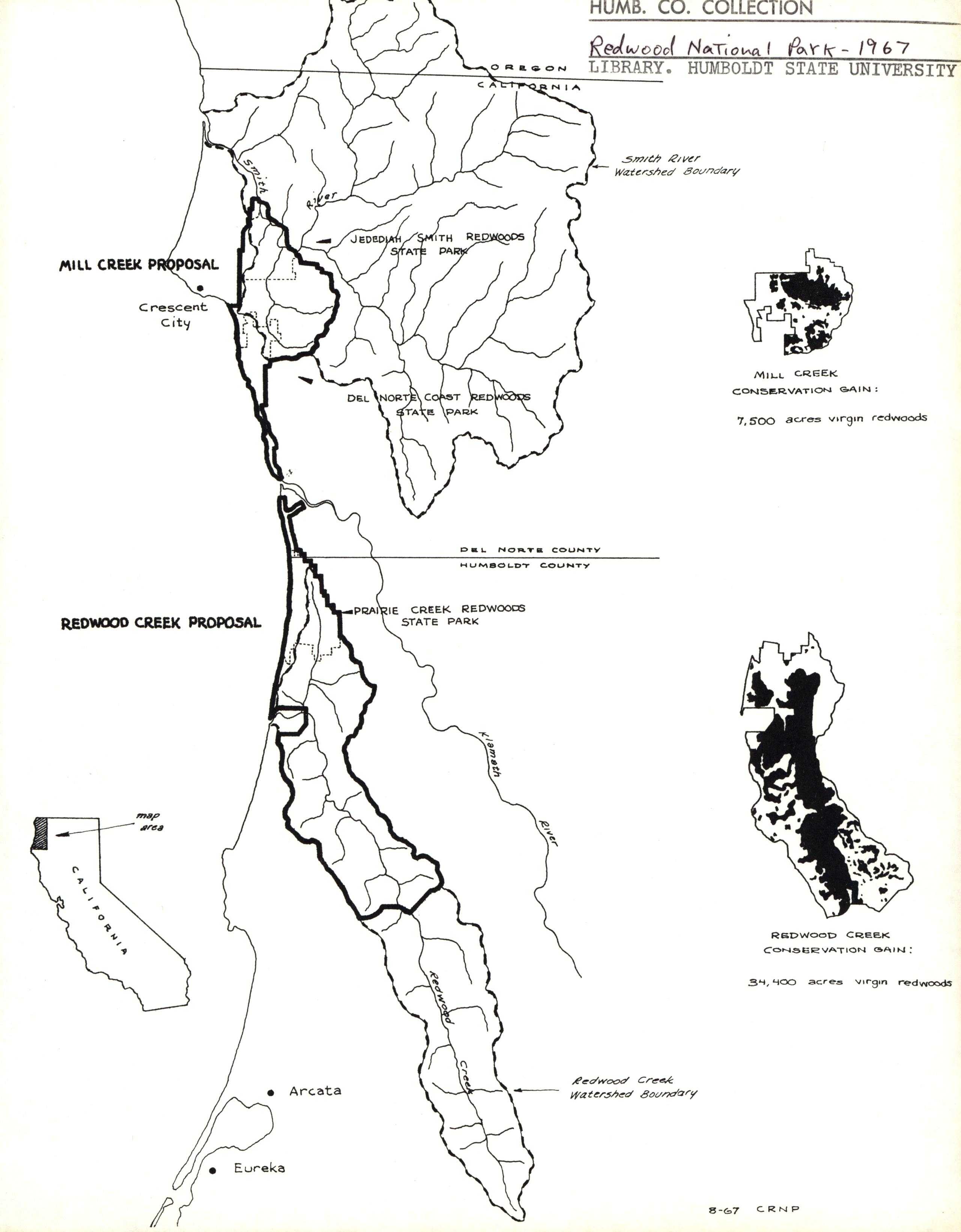A map produced by Citizens for a Redwood National Park illustrating the differences between the Mill Creek and Redwood Creek Proposals.