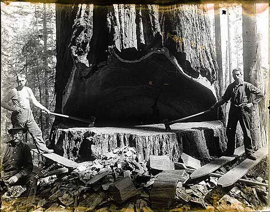 A photograph showing a logging crew posing in the process of cutting down an enormous Redwood tree.