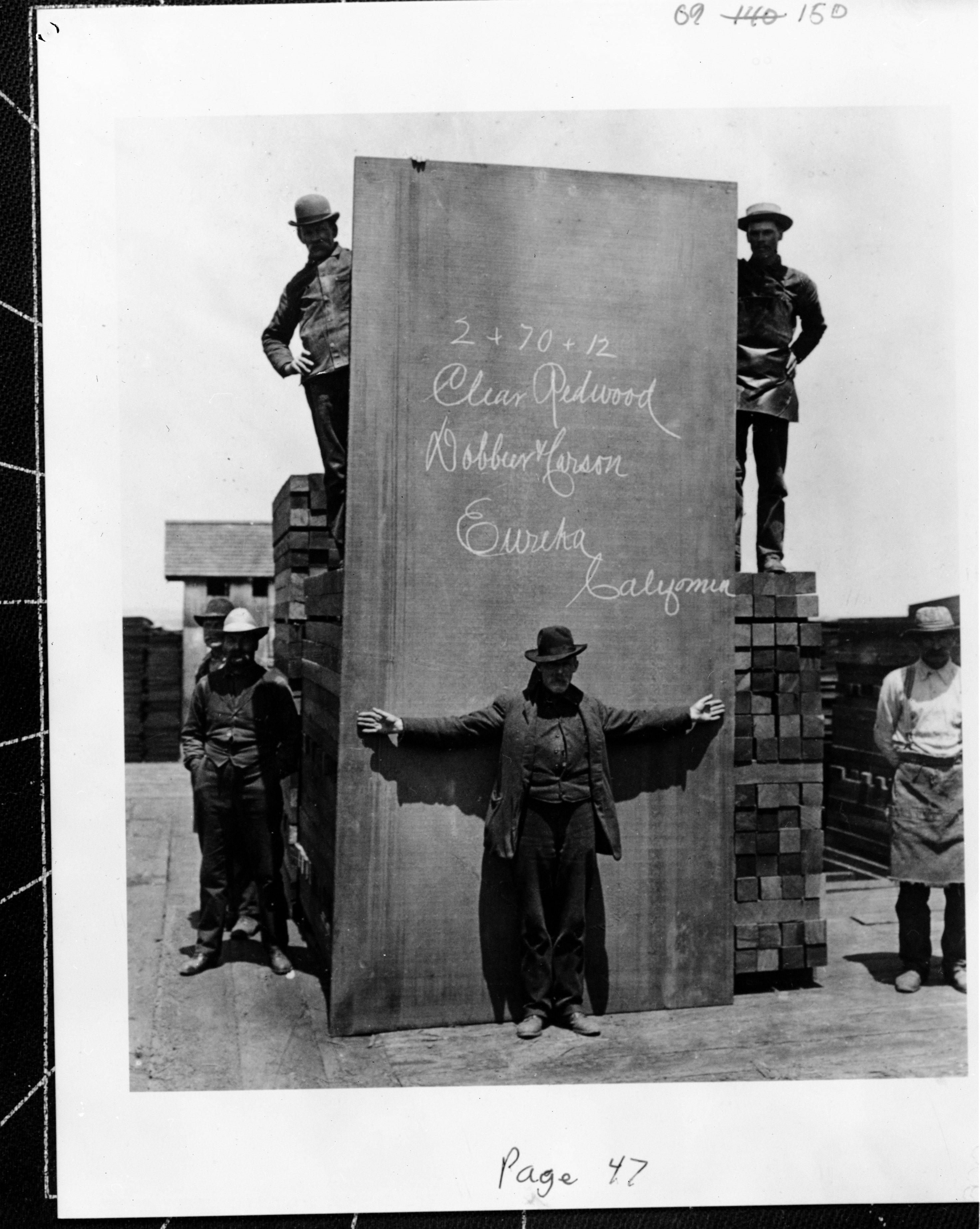 Man stands with arms wide open to display width of Redwood Lumber plank