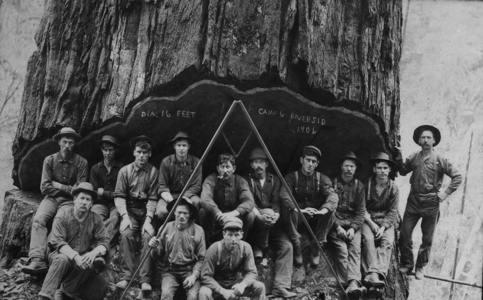 Group of men posing in the undercut of a redwood tree, holding a gunstick out in front.