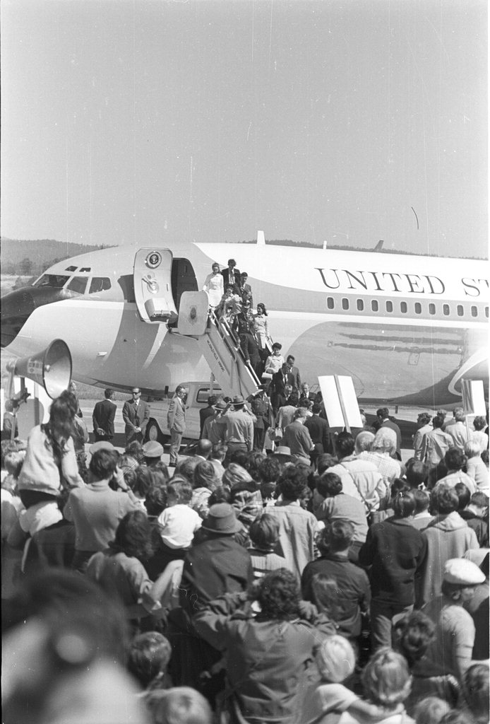 The Presidential Group leaving Airforce One at McKinleyville Airport to board Marine Helicopters for trip to Redwood National Park, August 1969.