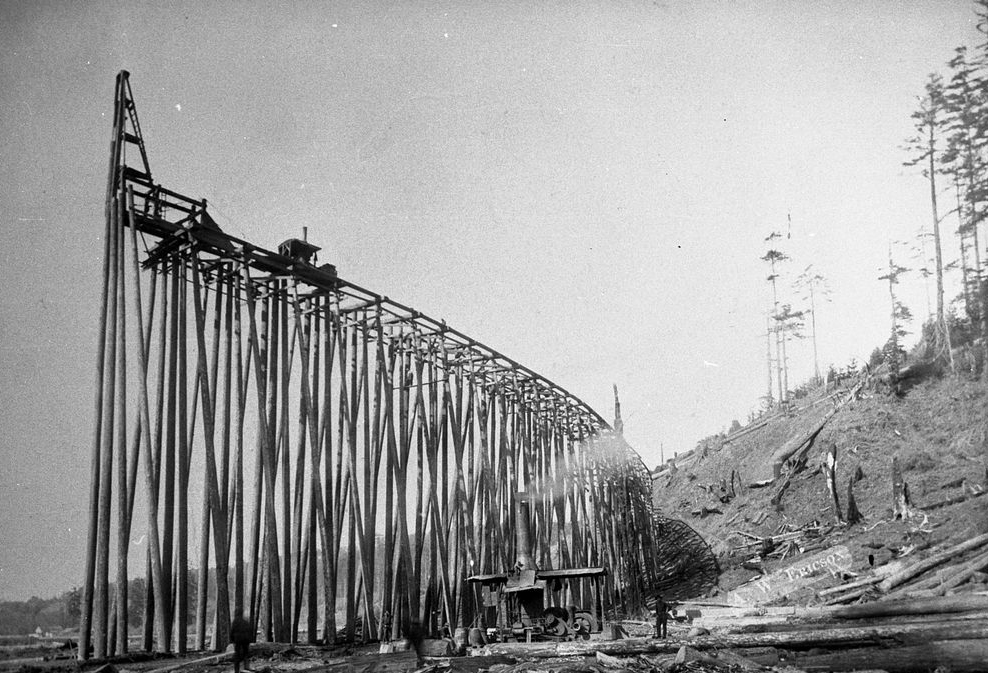A railroad trestle construction over Balke Creek in Little River Valley circa 1907-1910.