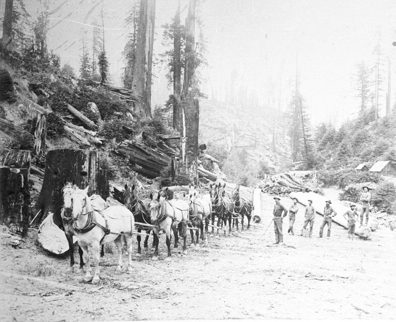 A team of horses pulls logs near Trinidad, California