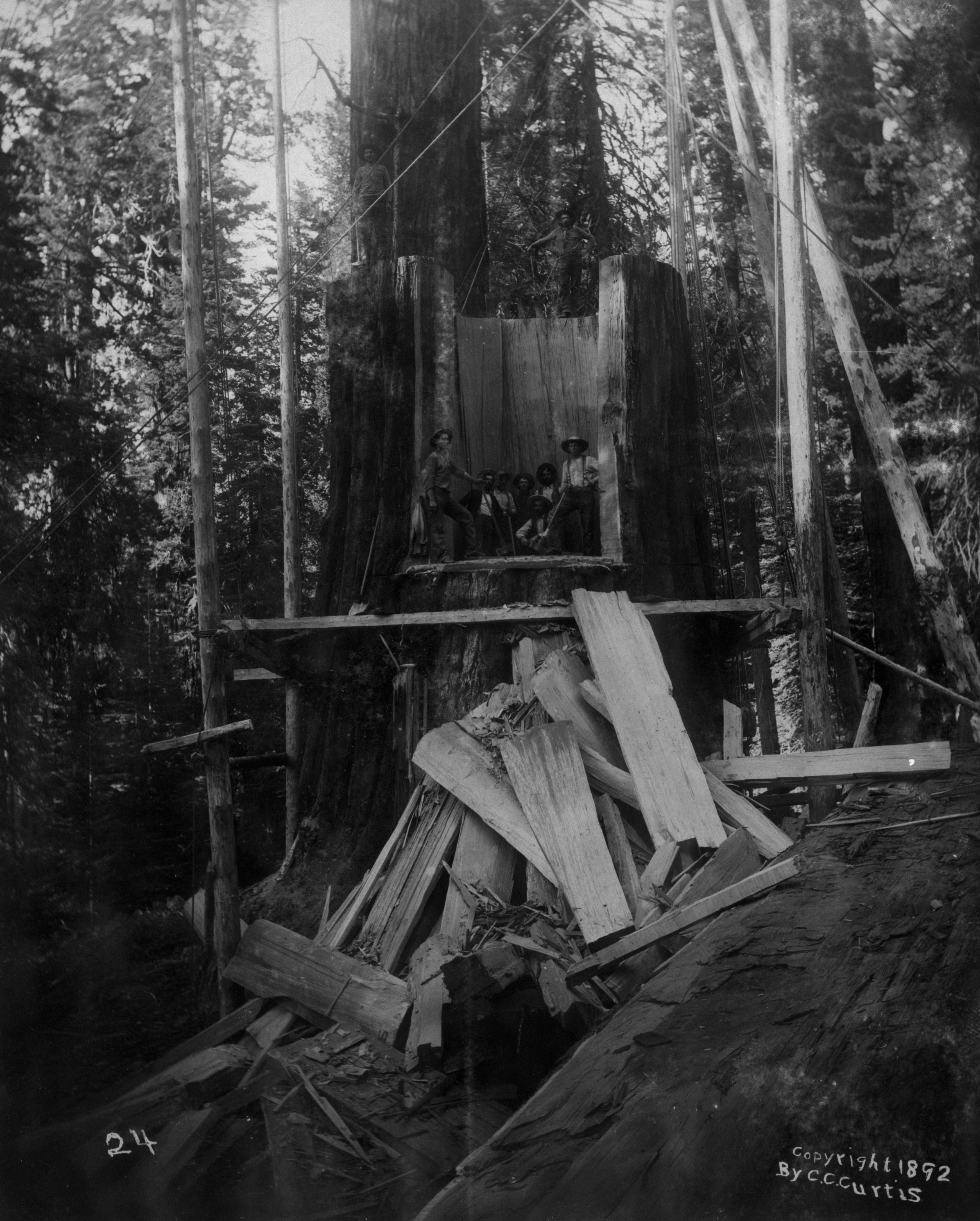 A Logging crew posing with their equipment in the center of the tree cut for display at the World's Fair in 1893.