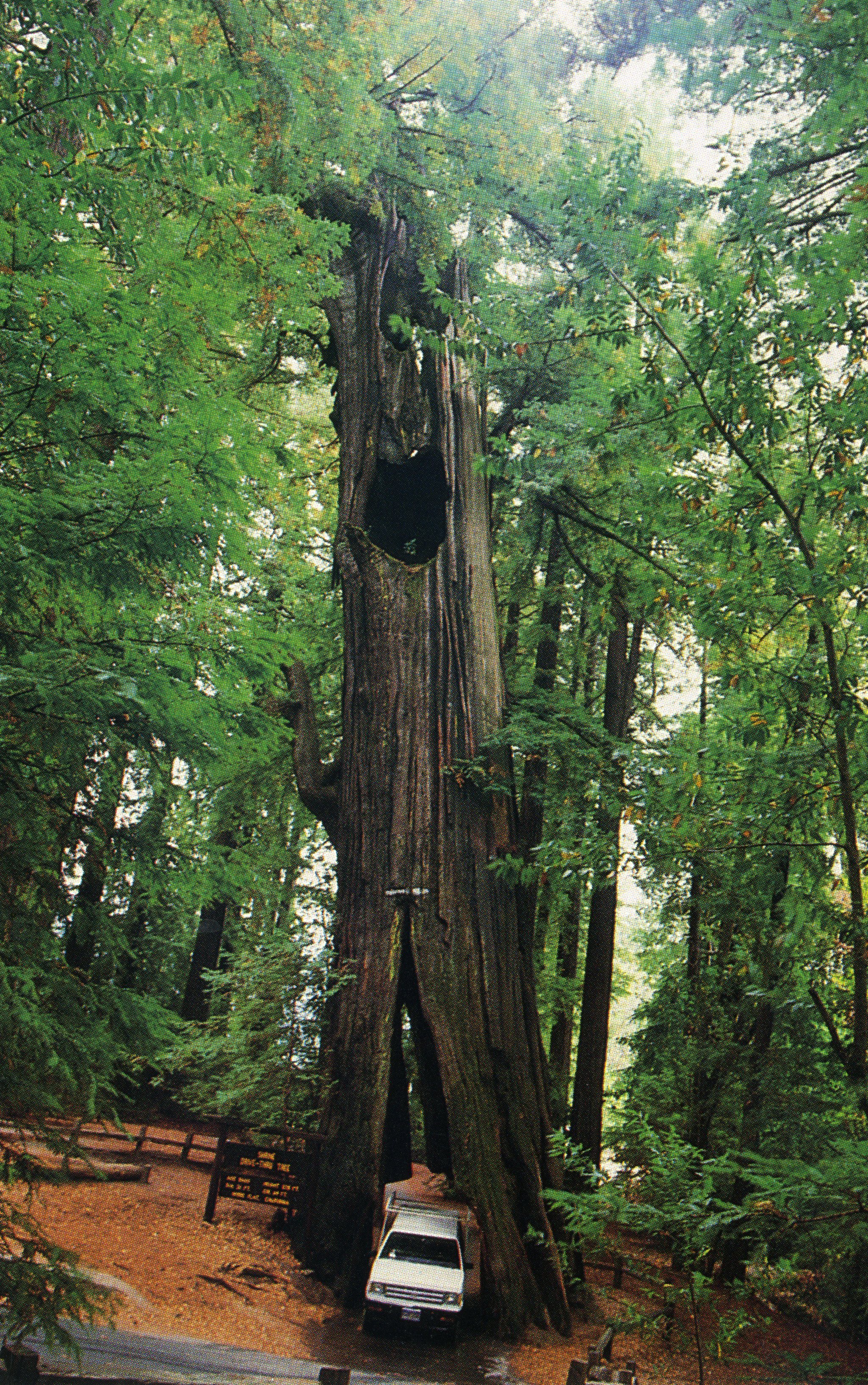 Shrine of the Redwoods was advertised as, the "original drive-thru tree on the Avenue of the Giants Highway. The tree's natural opening was hallowed out by fires centuries prior.
