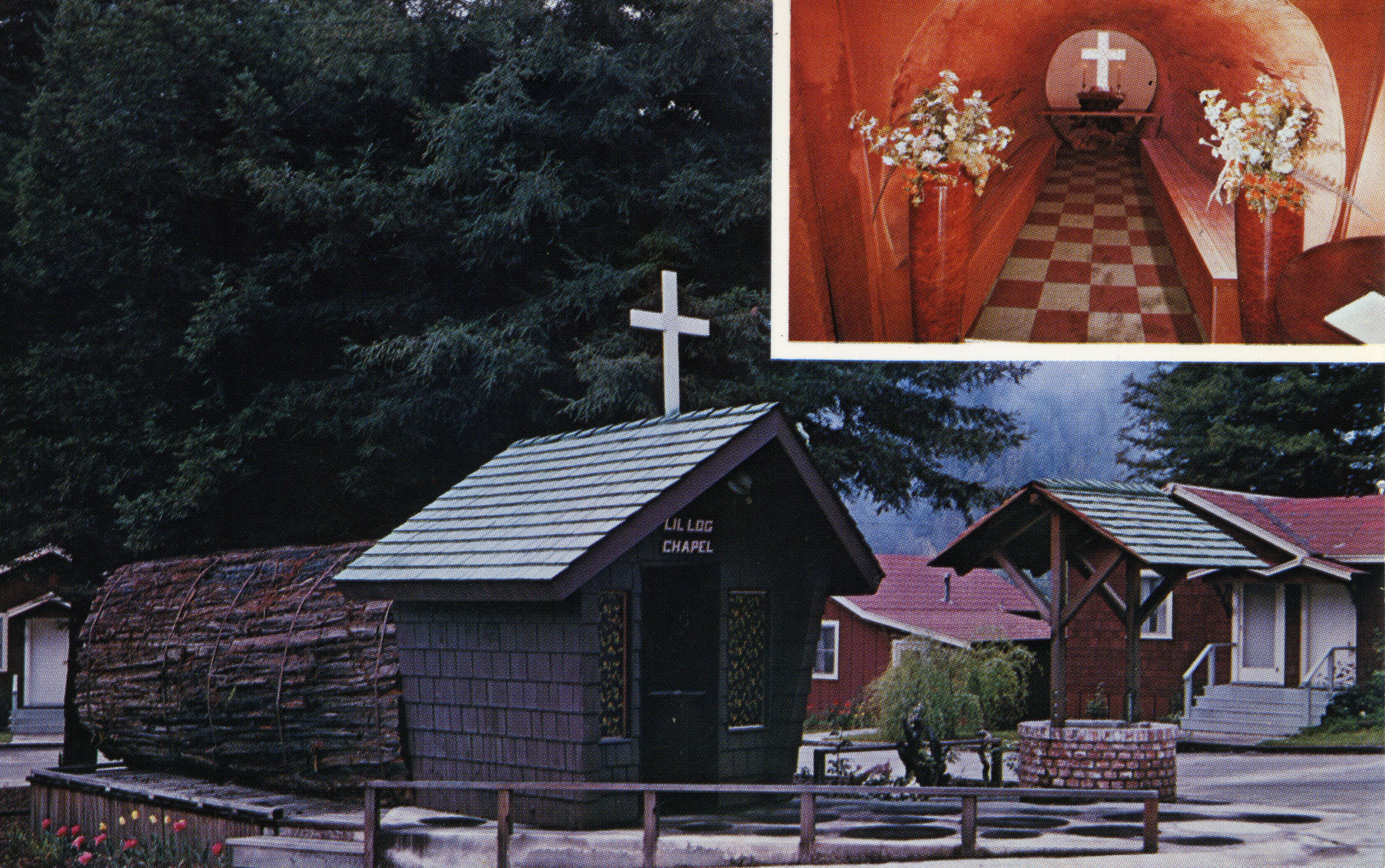 The Redwood Log Chapel is advertised as, "a fine place to rest and meditate."