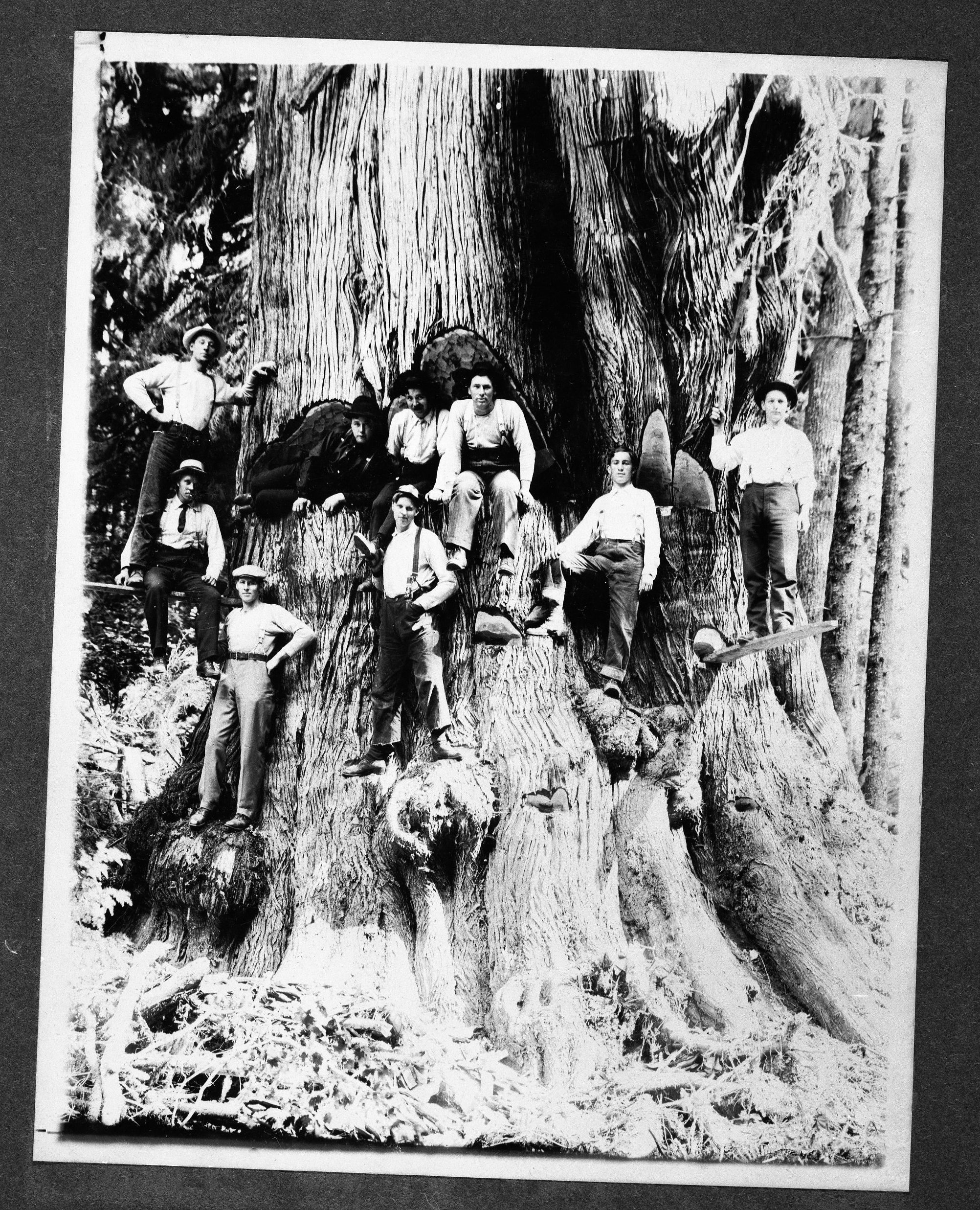 Men standing in undercuts, on burls and on spring boards throughout base of Redwood tree.